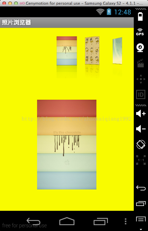 上面是一个自定义的Gallery控件,实现倒影和仿3D的效果,下面是一个图片查看器,点击上面的小图片,可以在下面查看大图片。