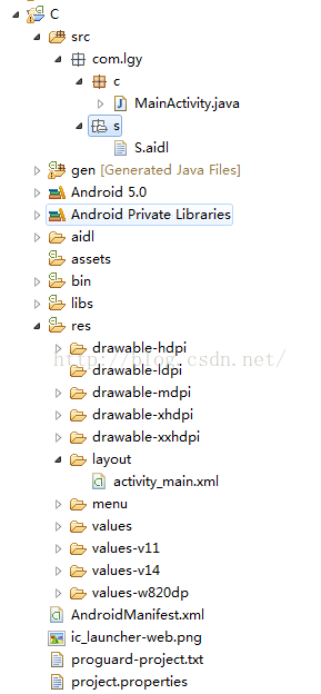 2)我们将在服务器端S写的aidl原封不动的移到客户端C上来(注包文件名都原封不动),移动后架构如下图: