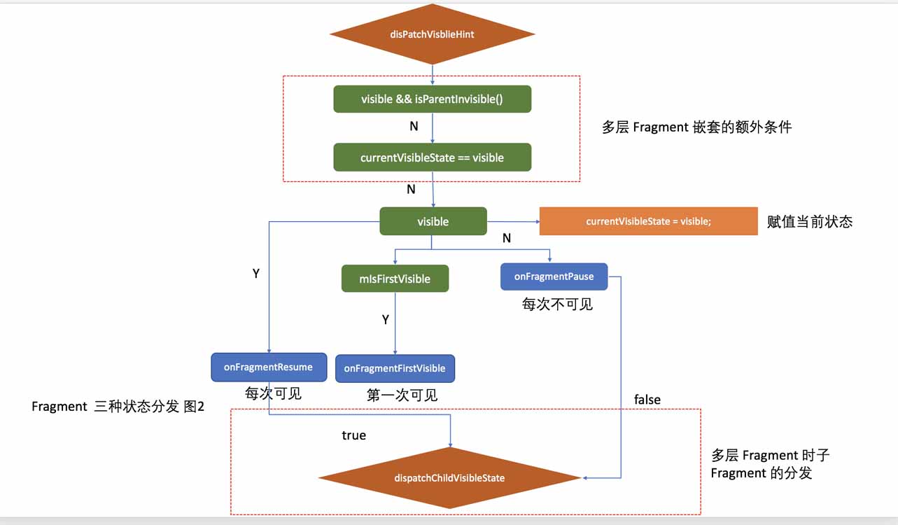 isViewCreated 和 Fragment 第一次创建的标志位 mIsFirstVisiblecurrentVisibleState 标志位,该标志位在 onResume 中和 onPause 中结合 getUserVisibleHint 的返回值来决定是否应该回调可见和不可见状态函数。整个可见过程判断逻辑如下图所示