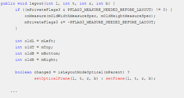 在layout阶段会去调用setOpticalFrame()或者调用setFrame()方法,从源码中可知setOpticalFrame()方法,最终还是调用的setFrame()方法。