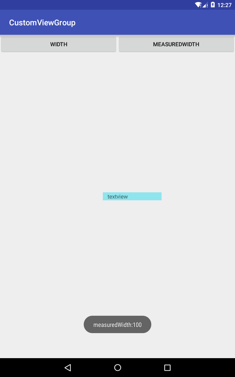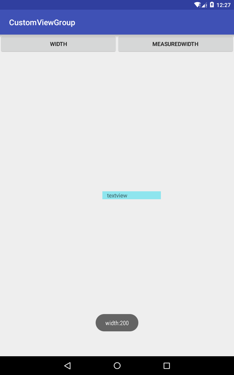 在这个demo中,我们给textview设置宽度为100px,但是在layout阶段给它加大到200,最终结果是:点击width按钮,显示为200,点解measuredWidth按钮显示为100.