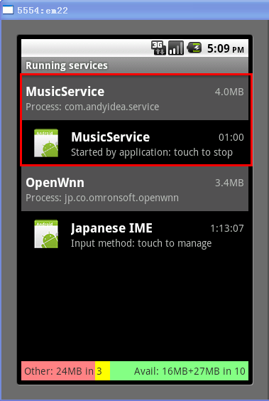 [7] 我们在Android终端设备中查看下刚才启动的音乐播放服务,看看我们退出程序后,是不是该程序的服务还在运行的呢?按如下步骤:Menu --> Settings --> Applications --> Running services 。在弹出的 Running services 中可以看到有哪些服务在运行。