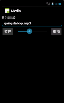 <TextView android:layout_width="fill_parent" android:layout_height="wrap_content" android:text="@string/hello" /> <EditText android:id="@+id/mediaFileName" android:layout_width="match_parent" android:text="gangstabop.mp3" android:layout_height="wrap_content" > <requestFocus /> </EditText> <LinearLayout android:id="@+id/linearButton" android:layout_width="match_parent" android:layout_height="wrap_content" > <Button android:id="@+id/playButton" android:layout_width="wrap_content" android:layout_height="wrap_content" android:text="@string/stop" /> <SeekBar android:id="@+id/playSeekBar" android:layout_width="140px" android:layout_height="wrap_content" android:layout_marginLeft="3px" android:layout_marginTop="5px" /> <Button android:id="@+id/replayButton" android:layout_width="wrap_content" android:layout_height="wrap_content" android:layout_marginLeft="3px" android:text="@string/replay" /> </LinearLayout>