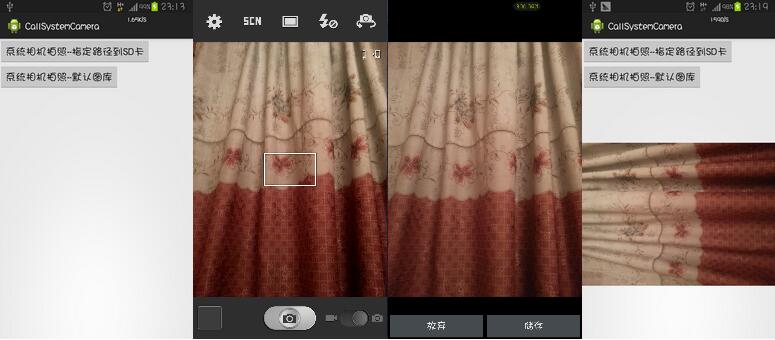 上面讲解了如何在开发的应用中使用系统相机拍摄照片并获得它所涉及到的内容,下面通过一个简单的Demo演示一下。在Demo中,有两个Button分别以指定路径的方式和不指定路径的方式启动系统相机,并获取返回值显示到ImageView中,Demo中注释比较详细,这里不再累述了。