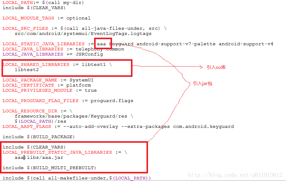 也就说引入jar包主要依赖的是LOCAL_PREBUILT_STATIC_JAVA_LIBRARIES和LOCAL_STATIC_JAVA_LIBRARIES。下面吧完整的Android.mk贴出来,方便拷贝。