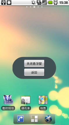 如果点击了小悬浮窗会弹出大悬浮窗来,这里我们大悬浮窗做的比较简单,就只有两个按钮。大悬浮窗展示的时候手机的所有其它程序是不可点的,因为焦点都在悬浮窗上了。点击返回按钮会重新展示小悬浮窗,点击关闭悬浮窗按钮,Service也会一起停掉。