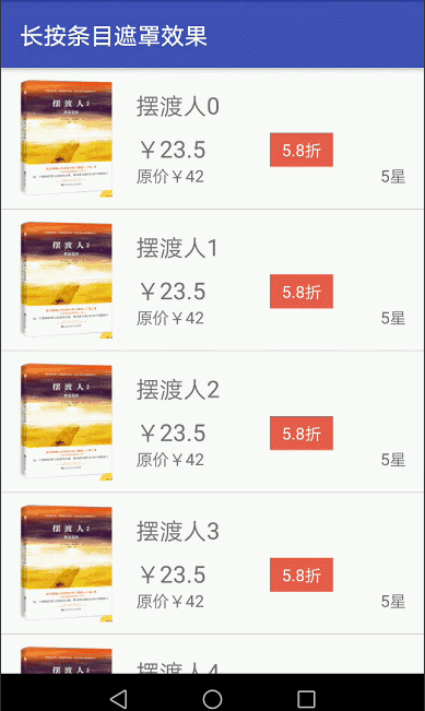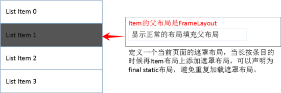 1. 遮罩的效果,我们会很容易的想到Android布局控件FrameLayout布局,是基于叠加在上方的布局。所以在列表条目布局的时候,可以使用FrameLayout布局,在长按列表条目时,用条目的根布局添加一个遮罩的布局,就达到我们想要的效果了。