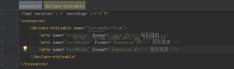 1.首先在我们的res/values/目录下建立一个attrs.xml文件,然后在里面声明我们我们需要的自定义属性