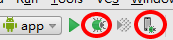 - 点击图中红色圆圈圈起的左边绿色按钮,运行app的debug模式,快捷键Shift+F9