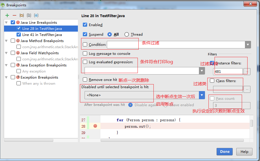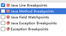 这张图可以看出断点也有行断点、方法断点、字段断点、异常断点。其实打断点仔细观察也可以发现它们的标识图片是不同的,就是上图中每行前面的那四种不同的小红点。
