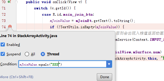 右击断点,可以设置condition。如图所示,设置一个变量mJoinVaule.equals(“222”),点击Done。当在mJoinEt这个EditText中输入222时才会触发这个断点。