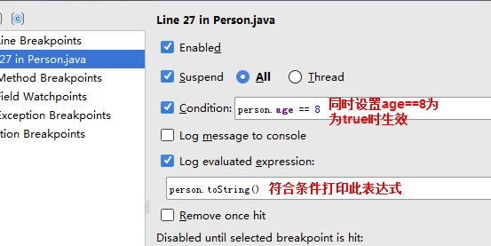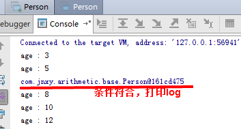 断点打在上方代码第27行,选中代码,同时设置Condition和Log evaluation expression,这样只有person.age==8时断点生效,才会在log打印表达式。当然,也可以值设置Log表达式。控制器输出如下图,可以看到只有age==8时才打印了toString().