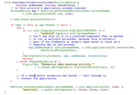 startSpecificActivityLocked中会判断app是否为空,app实际类型是ProcessRecord,代表Activity所属的进程信息。如果为空就调用AMS.startProcessLocked创建进程。