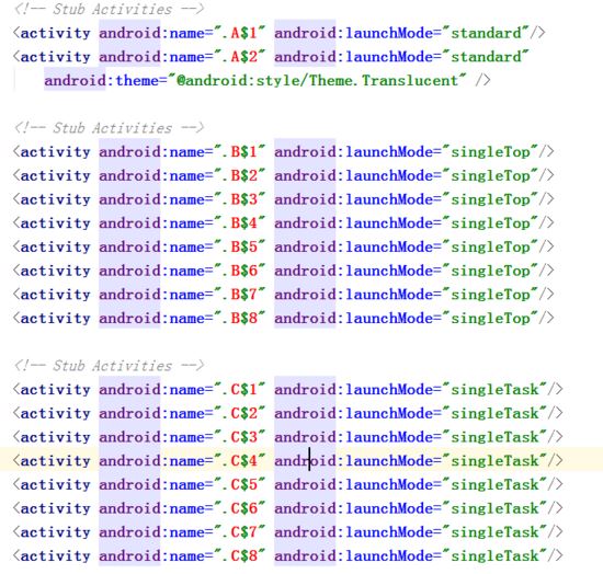 宿主AndroidManifest.xml中配置了各种启动模式的占坑Activity。