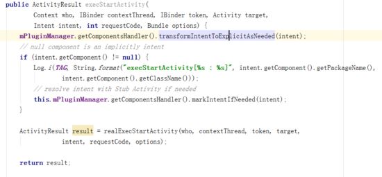 execStartActivity是ContextImpl.startActivity调用的第一个函数,VirtualApk通过hook这个函数,markIntentIfNeeded函数将启动插件的Intent转换成启动占坑的Activity。