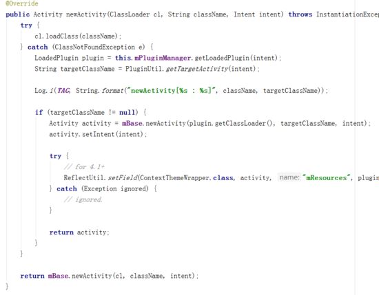 刚刚完成了狸猫换太子,绕过了ActivityNotFound的检测,在newActivity创建Activity对象的时候需要再换回来,也就是将宿主占坑Activity的调用换回到实际插件Activity的加载。