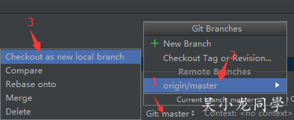 我们新建一个分支(Branch1)后,这时如果我们要切换到master分支,我们点击Local Branches下面的按钮,然后在其左边会弹出一个对话框,我们点击Checkout就可以将其切换到master分支下了。要明白的是Local是存在本地Repo的,你可以直接进行切换。Remote是远程仓库的,远程仓库的你只能checkout到本地,而不能切换过去。 切换分支,addcommit下,防止代码丢失。