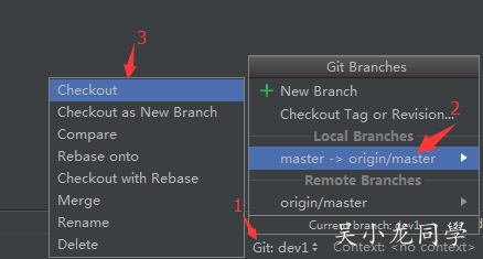以 origin/master 为基础 checkout 本地分支 dev1。