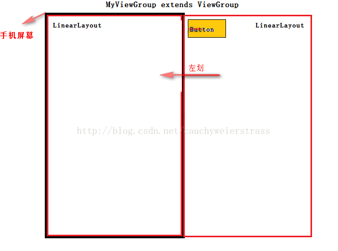 自定义这样一个ViewGroup,layout两个线性布局,左边的LinearLayout覆盖全屏幕,右面的LinearLayout在屏幕外面隐藏。然后观察在想做滑动的过程中,第二个LinearLayout显示出来的过程中,按钮Button和第二个线性布局的位置信息: