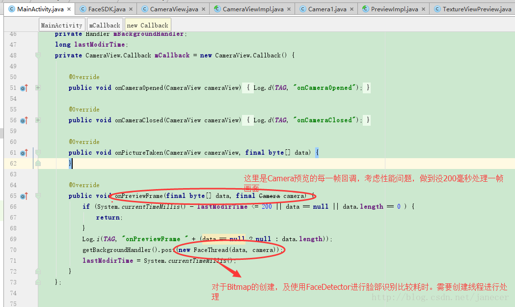 google CameraDemo主要改了这么多,下面来看看在获取到每一帧时对图像的处理跟识别