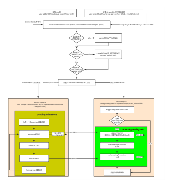 从上面的方法中可以看到,flag全都没有激活的话,那就没有任何显示或者隐藏的动画了。 CHANGE_DISAPPEARING 和 CHANGE_APPEARING 控制的是父view和非新添加view的动画, APPEARING 和 DISAPPEARING 控制的是新添加view的动画。