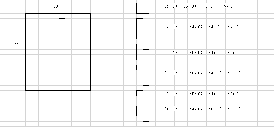 如正方形方块有四个点,坐标分别为(4,0)(5,0)(4,1)(5,1)。用List< Point[] >类型的listPoints来保存坐标集合。注意:每个下落方块的第一个坐标点均是有特殊作用的,这个后边会说到。