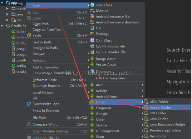 我们知道Eclipse创建的工程默认是有个assets文件夹的,但是Android studio默认没有帮我们创建,那么我们就自己创建一个就好啦。