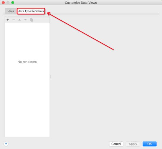 接下来在 Customize Data Views 弹窗的Tab中选择 Java Type Renderers 项,如下