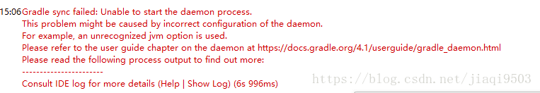 这个问题是我第一次看见,然后就开始了各种百度,有说需要在Android/.gradle文件夹下面添加gradle.properties文件的,还有是在项目根目录的gradle.properties文件里面添加org.gradle.jvmargs=-Xmx512M的,结果测试了都没有效果,最后还是在另一篇博客中看到了解决办法: