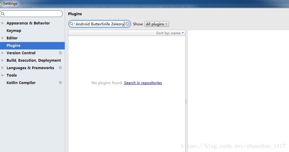1.打开Android Studio中的设置界面,并且点击左边的插件Plugins,在搜索框中输入 Android ButterKnife Zelezny