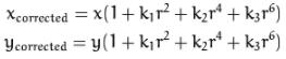5.这里不对标定过程和opencv校正过程详细推理。这里使用代码实现简单的畸变算法,考虑到效率和实时性,略去切向畸变,径向畸变假设x,y相等且只取一阶K值,其实一阶K值大约已经可以把畸变控制人眼接受的范围内了。