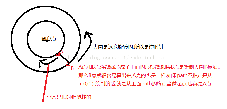 现在还我们效果还差外圆的大圆的效果了,那么大圆是在小圆动画执行完毕后再去做旋转效果的,那好,我们只要监听动画就可以,画图: