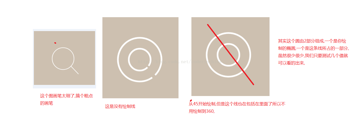 如果单纯的绘制这个图很简单很简单的,绘制一个圆,然后再绘制一根线就搞定,但是要考虑这里的效果,就不能这么干了,如果你看了上面的gif图就知道,其实这是2个同心圆,然后前一个path的起点和后一个path的起点相连接就是形成一条直线了,但是path中的图形内容也就是这个圆是怎么绘制出来的呢?如果是绘制圆的话,上面的线起点和终点位置怎么去计算,这是个问题,但是我们绘制圆还可以使用绘制椭圆的形式也是可以绘制达到圆的效果,从45度开始绘制一个圆,是不是这个线的起点搞定了,分析图如下: