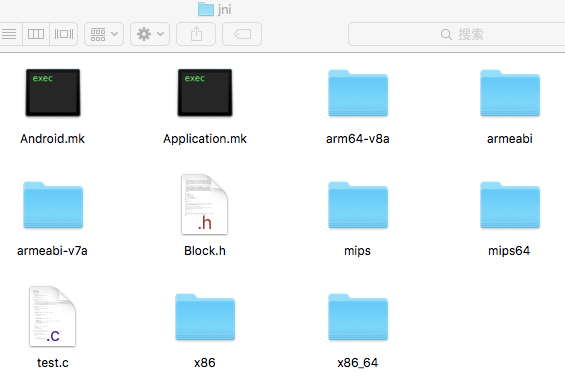 然后,我们把上述编译脚本中所列出的my_block_test.c、my_blocks_data.c以及my_runtime.c这三个源文件放在jni目录下即可编译。