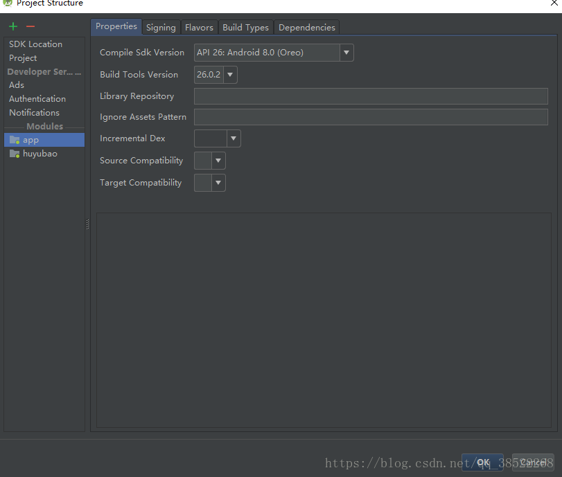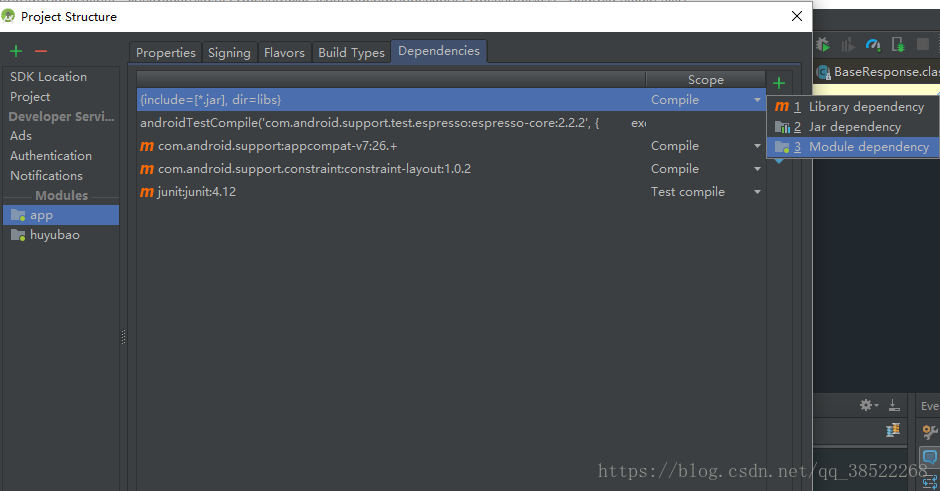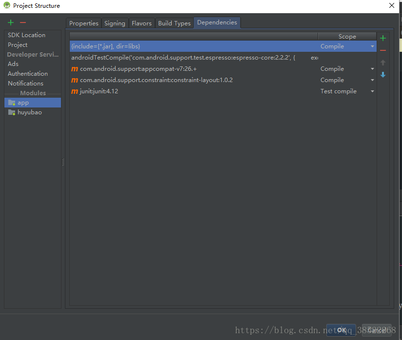 5,选中Modules下的app,注意这个app就是你自己new project的module,下面这个huyubao就是我之前添加的,再选择Dependencies