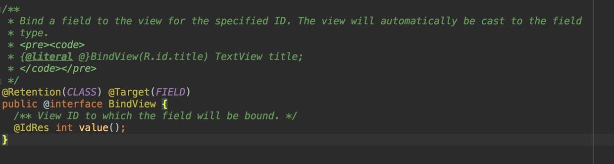 运行时注解RUNTIME如上2.1所示,大多数时候实在运行时使用反射来实现所需效果,这很大程度上影响效率,如果BufferKnife的每个View注入不可能如何实现。实际上,ButterKnife使用的是编译时注解CLASS,如下图X2.2,是ButterKnife的@BindView注解,它是一个编译时注解,在编译时生成对应java代码,实现注入。