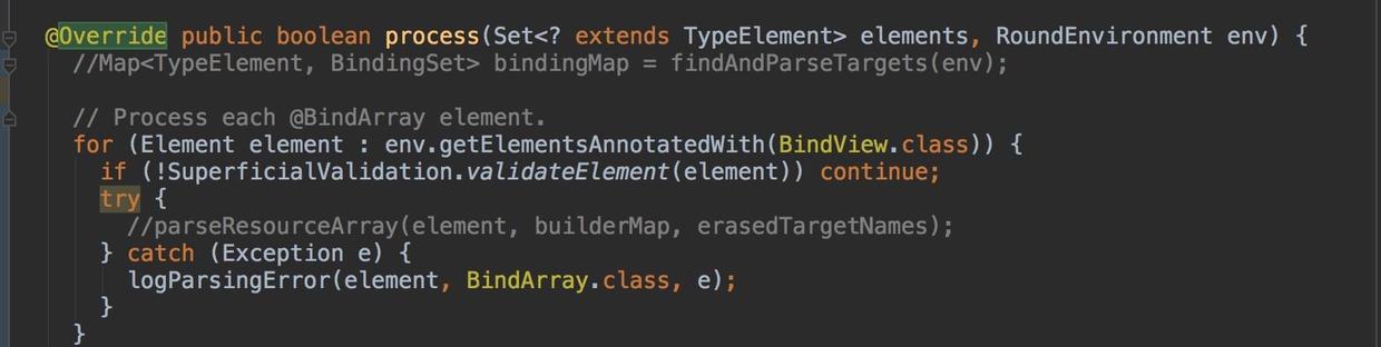 public boolean process(Set<? extends TypeElement> an, RoundEnvironment env) { for (Element e : env.getElementsAnnotatedWith(BindView.class)) { // 检查元素是否是一个类