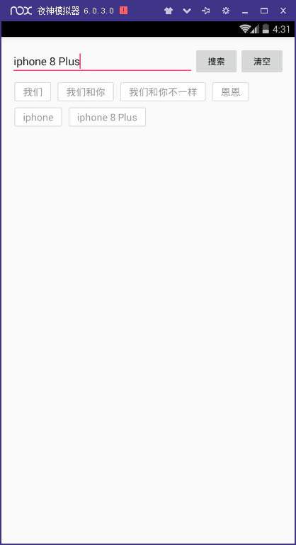 效果图:点击搜索框将搜索的历史在流式布局中展示出来,清空历史记录就会将历史清空,每次搜索后都存入sp中,每次进入页面都先判断sp里是否有值并展示