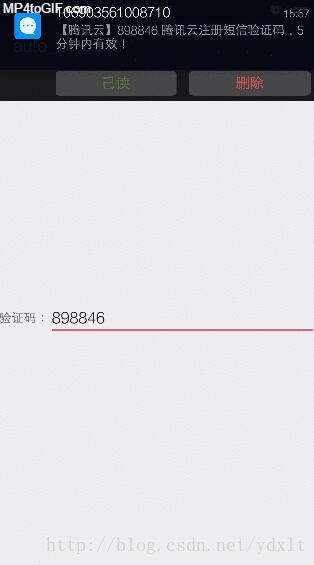 这个demo的代码实现比较简单,就是监听广播,读取收到的短信,然后过滤筛选出我们要的验证码短信,再用正则表达式提取到验证码设置给EditText显示即可。大家下载或者自己编写这个demo并更改发送方短信号码运行,然后可以找个注册网址或是模拟验证码短信进行测试。