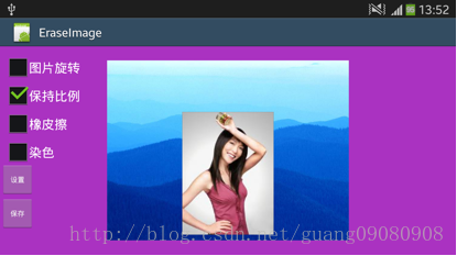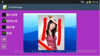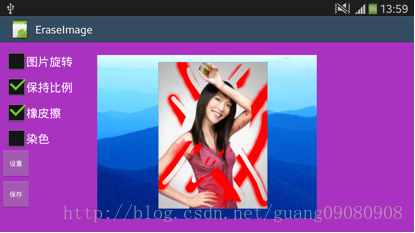 橡皮擦的实现用了两个canvas,一个临时的,一个是作用在ImageTouchView上显示的,代码里面有注释,这里不再详细介绍。