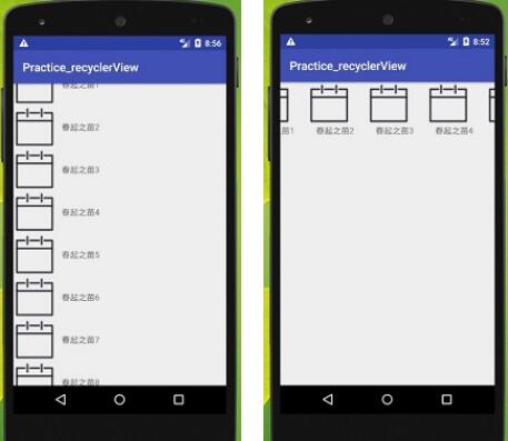 今天学习RecyclerView,下边来说一下实现数据垂直滚动和数据横向滚动。先上图为敬: