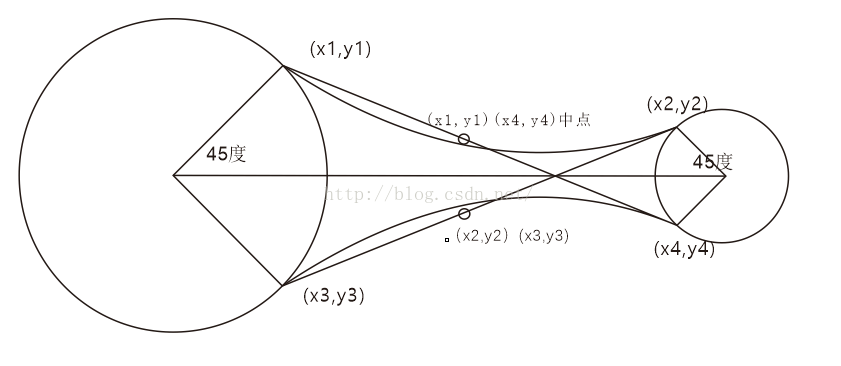 当距离小于300时,drawOval方法在原始位置画一个随距离增大而变小的圆,同时获取贝塞尔曲线的Path并且用drawAdhesionBody方法画出,画贝塞尔曲线原理图如下