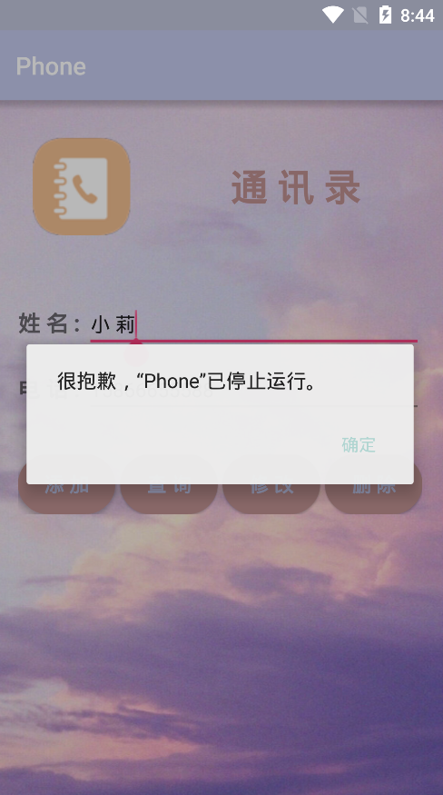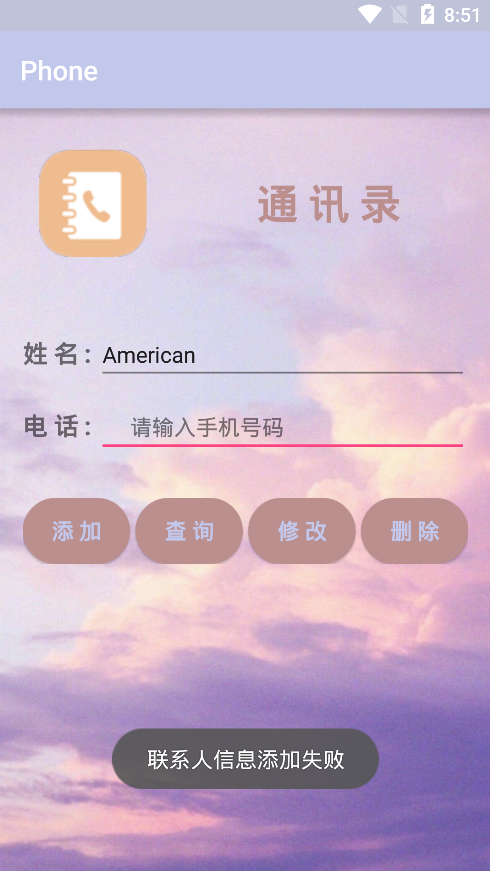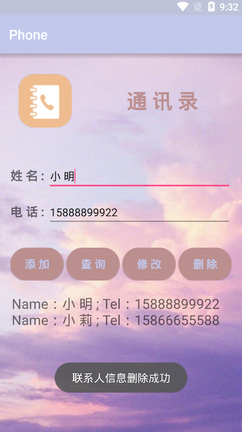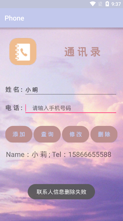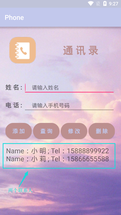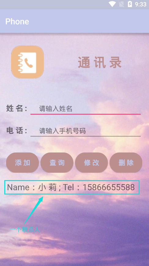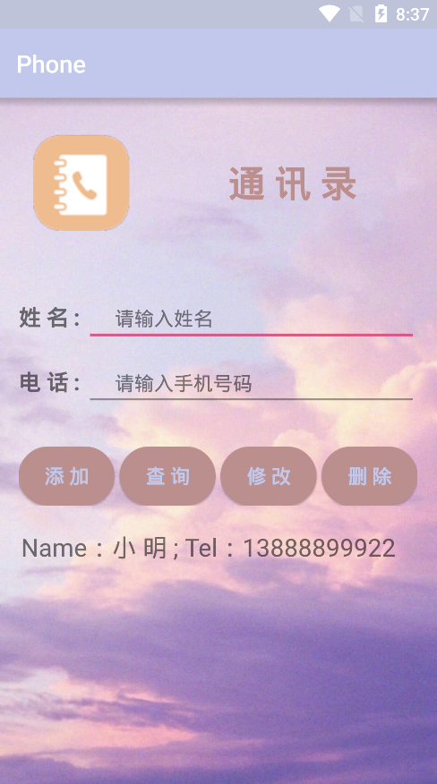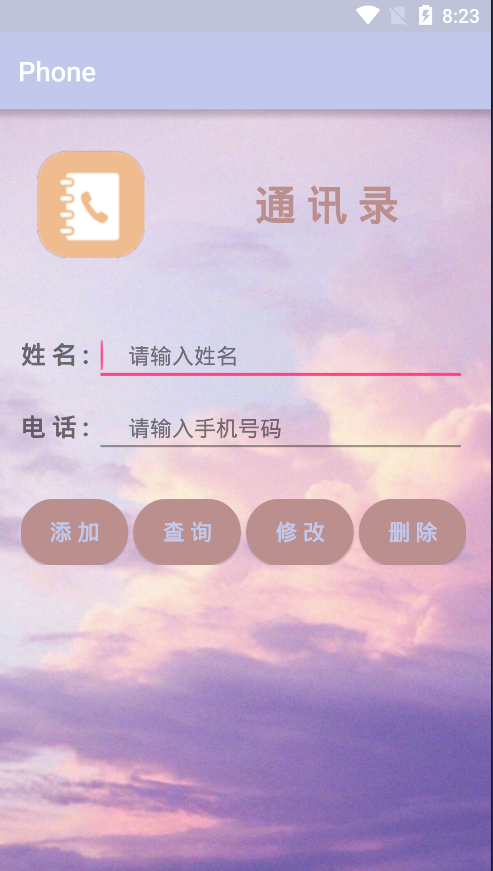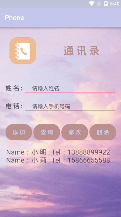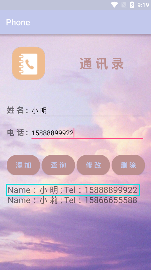 <?xml version="1.0" encoding="utf-8"?> <RelativeLayout xmlns:android="http://schemas.android.com/apk/res/android" xmlns:tools="http://schemas.android.com/tools" android:layout_width="match_parent" android:layout_height="match_parent" android:background="@drawable/background" tools:context=".MainActivity"> <LinearLayout android:layout_width="match_parent" android:layout_height="wrap_content" android:id="@+id/lineOne"> <ImageView android:layout_width="wrap_content" android:layout_height="wrap_content" android:background="@drawable/head" android:layout_margin="30dp"/> <TextView android:layout_width="wrap_content" android:layout_height="wrap_content" android:text="通 讯 录" android:textSize="30dp" android:textStyle="bold" android:textColor="#BC8F8F" android:layout_gravity="center" android:layout_marginLeft="50dp" /> </LinearLayout> <LinearLayout android:id="@+id/lineTwo" android:layout_width="match_parent" android:layout_height="wrap_content" android:layout_below="@+id/lineOne" android:layout_marginTop="20dp" android:layout_marginLeft="18dp" android:layout_marginRight="18dp"> <TextView android:layout_width="wrap_content" android:layout_height="wrap_content" android:text="姓 名 : " android:textSize="18dp" android:textStyle="bold"/> <EditText android:id="@+id/et_name" android:layout_width="match_parent" android:layout_height="wrap_content" android:hint=" 请输入姓名" android:textSize="16dp" android:maxLength="14"/> </LinearLayout> <LinearLayout android:id="@+id/lineTree" android:layout_width="match_parent" android:layout_height="wrap_content" android:layout_below="@+id/lineTwo" android:layout_marginTop="10dp" android:layout_marginLeft="18dp" android:layout_marginRight="18dp"> <TextView android:layout_width="wrap_content" android:layout_height="wrap_content" android:text="电 话 : " android:textSize="18dp" android:textStyle="bold"/> <EditText android:id="@+id/et_phone" android:layout_width="match_parent" android:layout_height="wrap_content" android:hint=" 请输入手机号码" android:textSize="16dp" android:maxLength="11"/> </LinearLayout> <LinearLayout android:layout_width="match_parent" android:layout_height="wrap_content" android:id="@+id/lineFour" android:layout_below="@+id/lineTree" android:layout_marginTop="30dp" android:layout_marginLeft="18dp" android:layout_marginRight="18dp" android:orientation="horizontal"> <Button android:id="@+id/btn_add" android:layout_width="wrap_content" android:layout_height="wrap_content" android:background="@drawable/shape" android:layout_weight="1" android:text=" 添 加 " android:textSize="16dp" android:textColor="#c2c8ec" android:textStyle="bold"/> <Button android:id="@+id/btn_query" android:layout_width="wrap_content" android:layout_height="wrap_content" android:background="@drawable/shape" android:layout_weight="1" android:layout_marginLeft="4dp" android:text=" 查 询 " android:textSize="16dp" android:textColor="#c2c8ec" android:textStyle="bold"/> <Button android:id="@+id/btn_update" android:layout_width="wrap_content" android:layout_height="wrap_content" android:background="@drawable/shape" android:layout_weight="1" android:layout_marginLeft="4dp" android:text=" 修 改 " android:textSize="16dp" android:textColor="#c2c8ec" android:textStyle="bold"/> <Button android:id="@+id/btn_delete" android:layout_width="wrap_content" android:layout_height="wrap_content" android:background="@drawable/shape" android:layout_weight="1" android:layout_marginLeft="4dp" android:text=" 删 除 " android:textSize="16dp" android:textColor="#c2c8ec" android:textStyle="bold"/> </LinearLayout> <TextView android:id="@+id/tv_show" android:layout_width="match_parent" android:layout_height="180dp" android:scrollbars="vertical" android:layout_below="@+id/lineFour" android:layout_marginTop="20dp" android:layout_marginLeft="20dp" android:layout_marginRight="18dp" android:textSize="20dp"/> </RelativeLayout>