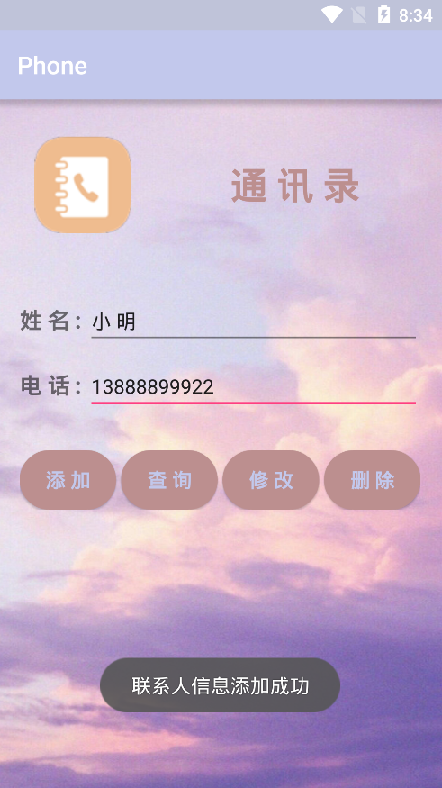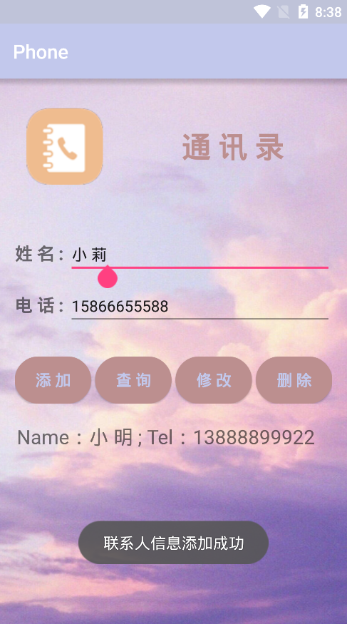 添加联系人功能验证:姓名:小 明 电话:13888899922