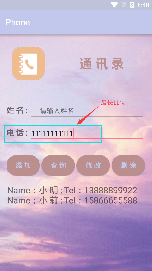 添加联系人功能验证:姓名:小 莉 电话:15866655588