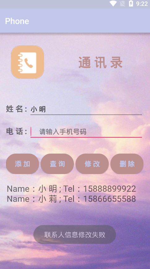 注意小问题:必须输入联系人姓名和电话号码,才可以成功进行修改,在数据库中修改一句name字段值进行匹配