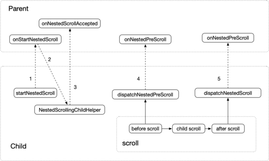 从这两个接口的方法可以看出这些方法都是一一对应的,比如 startNestedScroll 和 onStartNestedScroll,stopNestedScroll 和 onStopNestedScroll 等。从这些方法的命名上也能看出来嵌套滚动的交互顺序是 Child 主动触发,Parent 被动接受,所以决定是否打开嵌套滚动的方法 setNestedScrollingEnabled 由 Child 实现,决定开始和结束的方法 startNestedScroll 和 stopNestedScroll 也由 Child 实现。