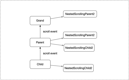 所谓三级嵌套滚动是在两级嵌套滚动之上再添加一个 Parent,这里为了表述方便将三级嵌套滚动的三级由上到下分别称为 Grand Parent Child。具体是由两对 NestedScrolling(Parent2/Child2) 接口实现,Grand 实现第一对接口的 Parent,Parent 实现第一对接口的 Child 和第二对接口的 Parent,Child 实现第二对接口的 Child。与两级嵌套滚动相比三级嵌套的 Grand 和 Child 和两级的 Parent 和 Child 区别不大,变化比较大的是三级的 Parent 既要实现两级的 Parent 接口又要实现 Child 接口,示意图如下: