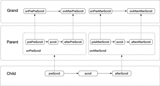二级嵌套滚动可以理解为给 Parent 提供了拦截 Child 滚动事件和处理 Child 剩余滚动事件的能力,具体逻辑可参考本文最开始介绍嵌套滚动的部分。相应的三级嵌套滚动给 Grand 提供了拦截 Parent 和处理剩余滚动事件的能力,只是拦截和处理的时机多了一些,如下图: