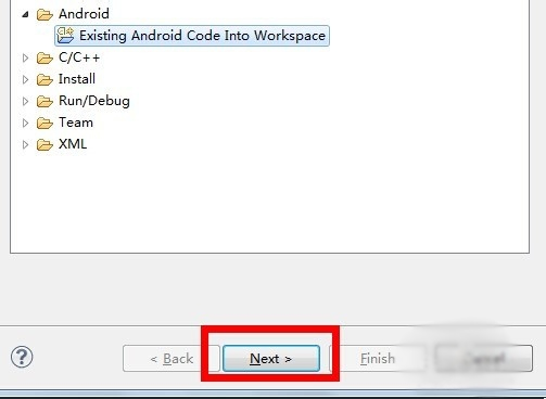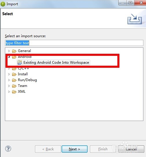 进入下一个页面之后。我们选择 导入的是 android文件。所以我们选择 下面红色方框里面的东西。点击 下一步